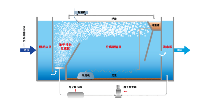孢子轉移技術,是將混凝技術、氣浮技術與微納米孢子相結合,通過定制化藥劑、微納米氣泡與水中的磷、疏水基懸浮物發生反應,創新形成的一種高效物理化學處理方法。主要解決了目前常用溶氣氣浮技術在應用過程中存在的處理效率較差、表面負荷較低、處理能耗較高、應急機動性不強等問題。